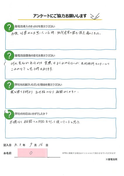 【蓄電池】長崎県大村市O様 エリア 長崎県大村市 蓄電池システム メーカー名 / 形名 SHARP(シャープ)JH-WB1821 蓄電池システム 設置kWh数 8.4kWh アンケート Q 蓄電池導入のきっかけを教えてください A 今後必要かとは思っていた時、助成金の話も頂き導入しました。 Q 蓄電池設置後の変化を教えてください A 何か変化があったかは実際はよく分からないが、夜間時折モニターにてこれかな?と思う時はあります。 Q 弊社をお選びいただいた理由を教えてください A 家を建てる時よりお世話になり相談がしやすい。 Q 弊社の対応はいかがでしたが? A 不満なく相談への対応を行って頂いていると思う。